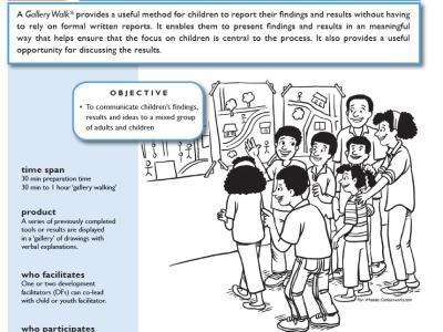 A Gallery Walk provides a useful method for children to report their findings and results without having to rely on formal written reports. It enables them to present findings and results in an meaningful way that helps ensure that the focus on children is central to the process.