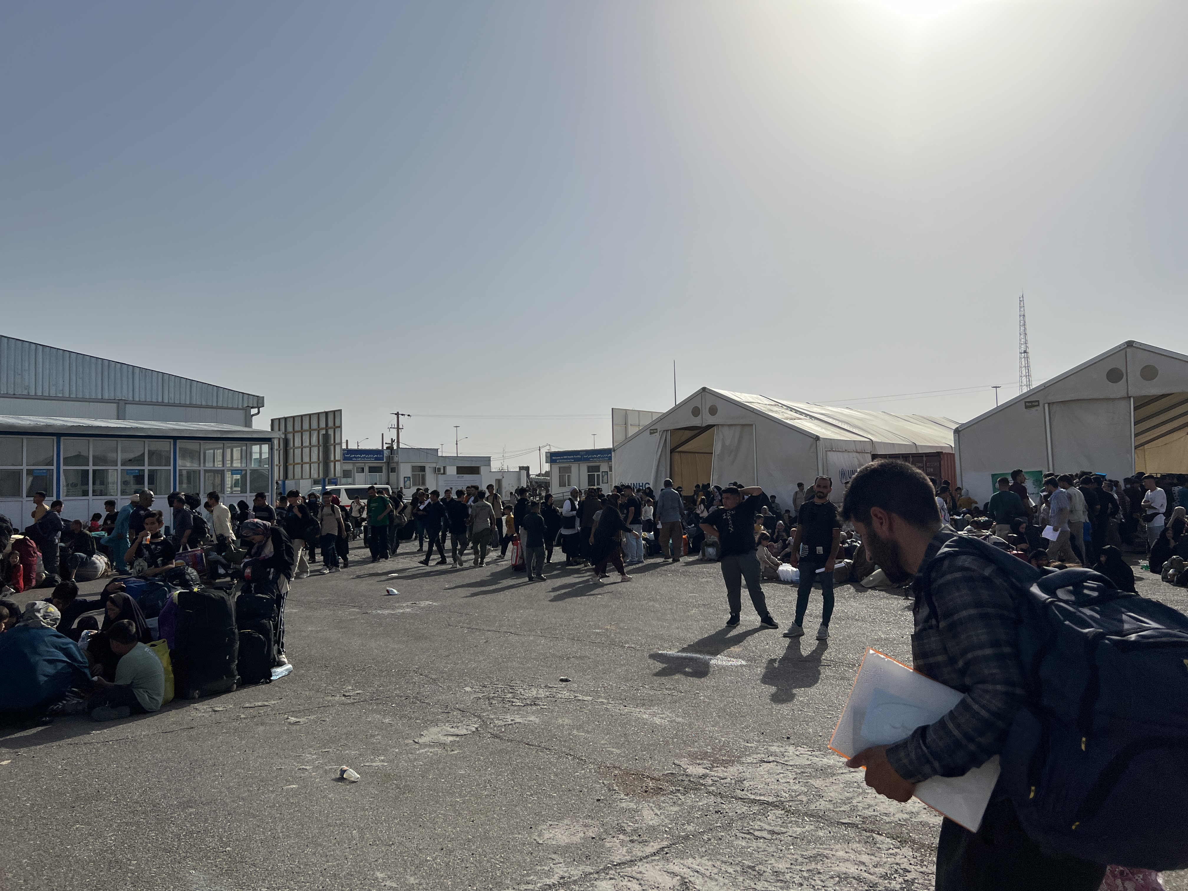 The road here is part of Asian Highway 1, notionally connecting Tokyo with Istanbul, and unlike most roads in Afghanistan, the asphalt is unbroken and perfectly finished. Yet, its assertion of prosperity through connectedness yields to a different reality as we slow to a halt at the first of several checkpoints approaching the border. With concrete subduing the dust clouds a little, we can see more here, and a steady stream of people on the move: small groups of young men, some looking bewildered, some casually defiant, older men and women bent under vast bundles of belongings, weary families with crying children, a few groups of young women looking uncertainly to the road ahead. Others have their heads down, leaning into carts laden with plastic sacks or battered suitcases, or indeed bearing elderly, disabled or unwell relatives unable to walk. Others seem to have no possessions, or only a small purse or bag.