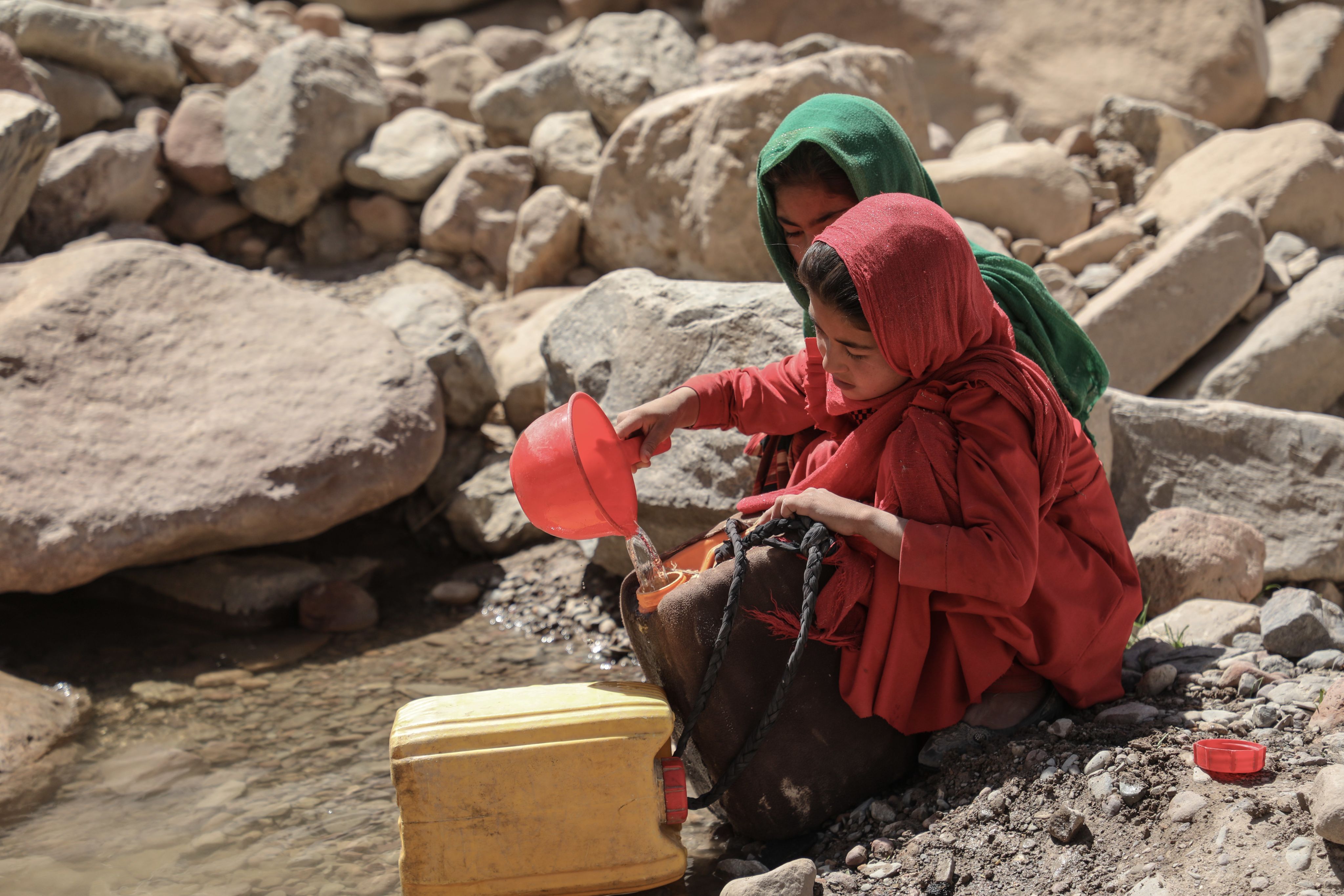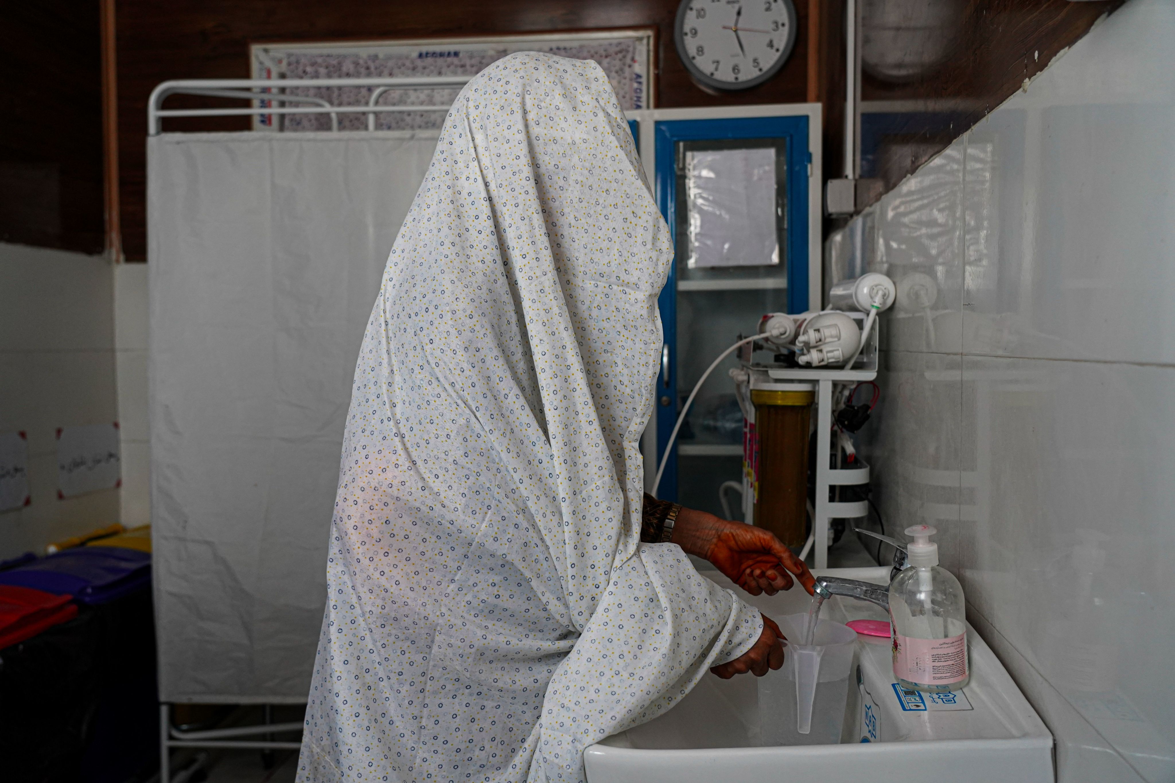 Laila’s mother-in-law fills a water canister from the clinic’s tap, as there are no safe water sources available in their village.