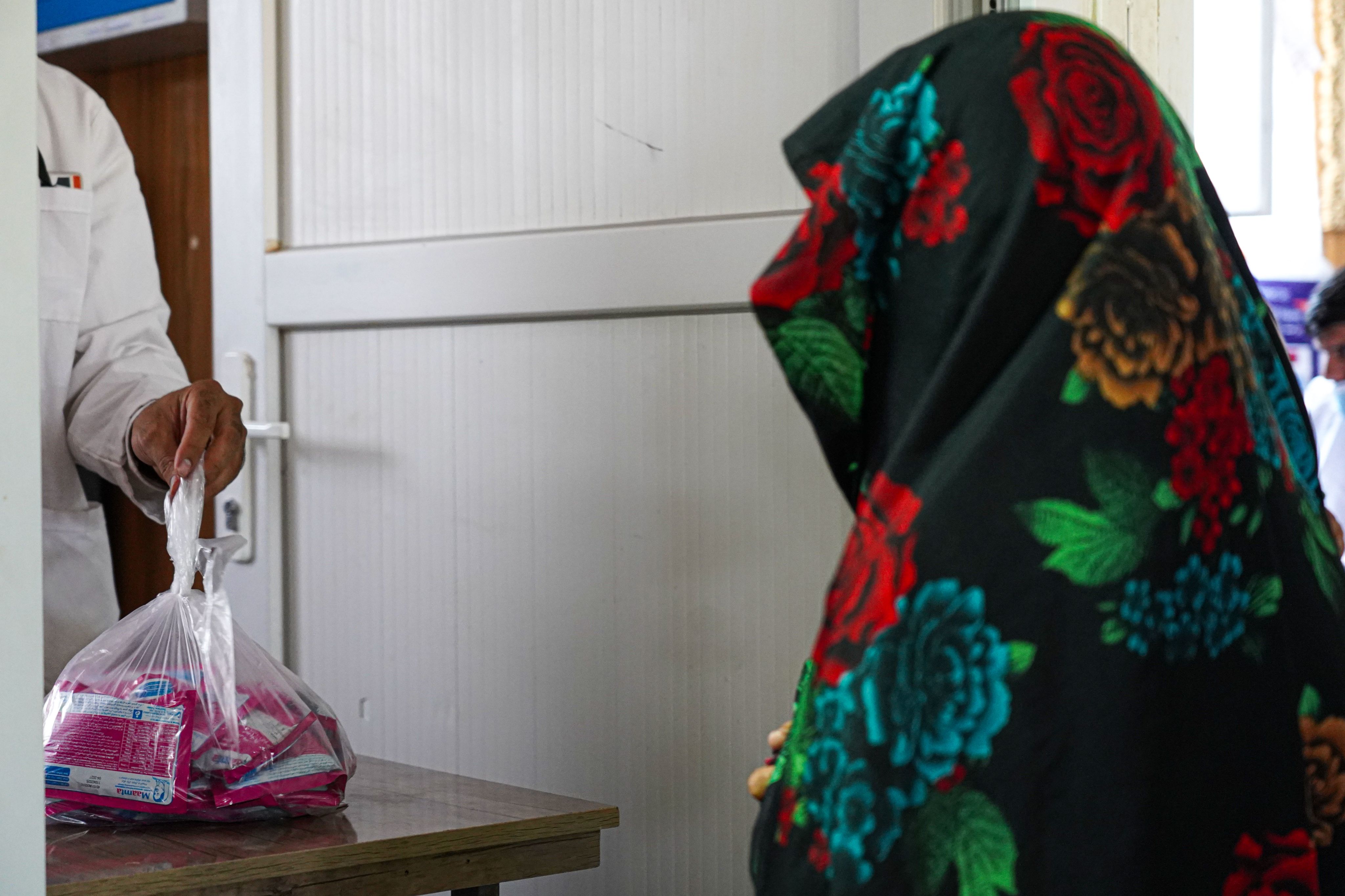 Laila receives a package of Lipid-based Nutrient Supplement (LNS) for her daughter at the FCDO-funded clinic, run by World Vision.