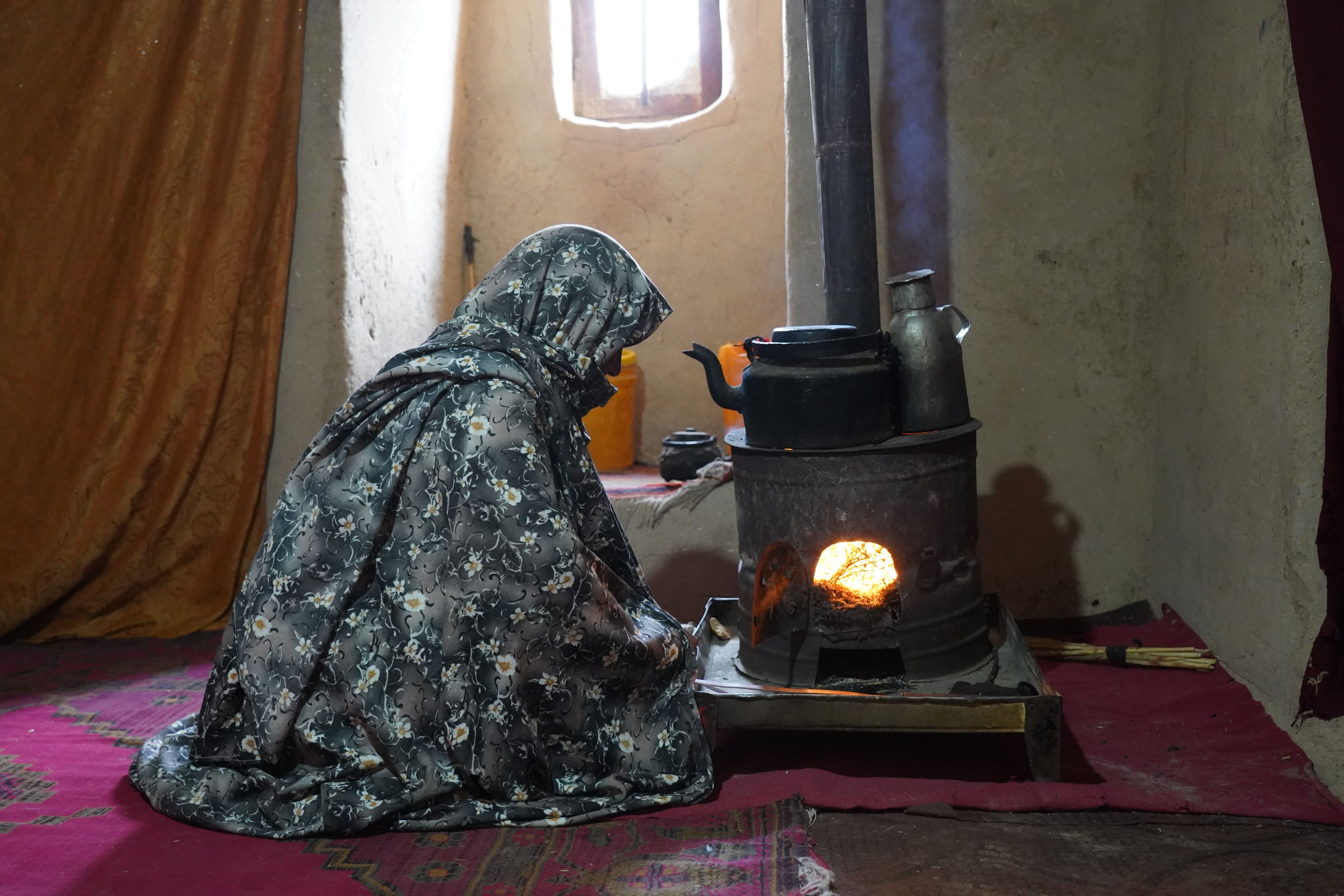 Widowed mother in rural Herat prepares a meal for her four children. In Afghanistan, 9,5M people are severely food insecure, and 4,7M women and children need malnutrition treatment. Many families survive on just one meal a day of rice or potatoes.