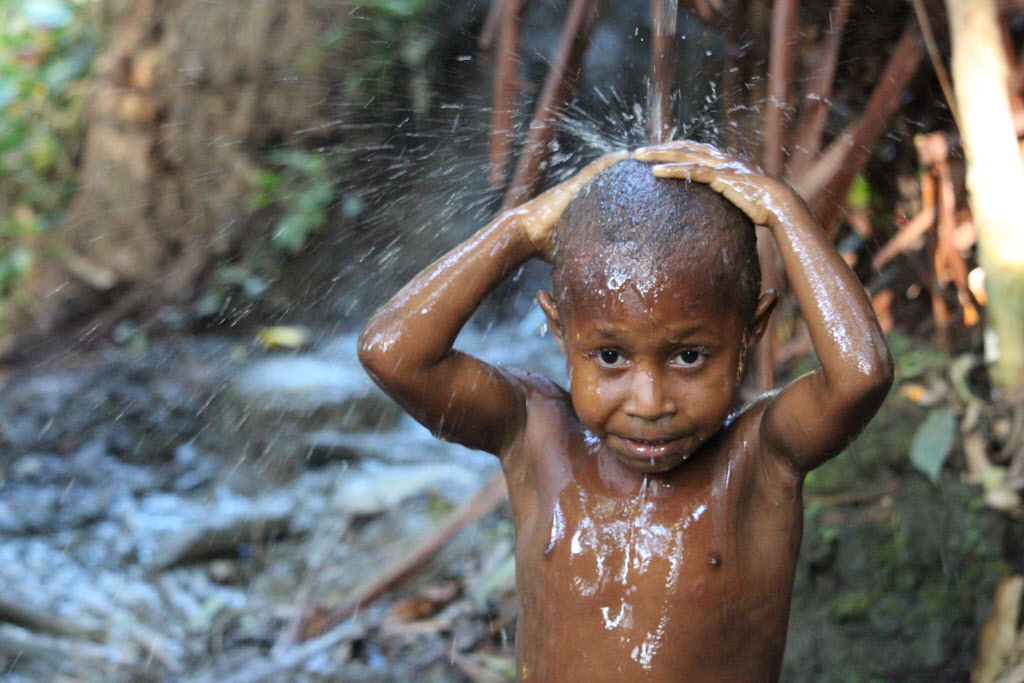 There’s just a few drops of stream water for bath time for 5-year-old Darius from Papua New Guinea. The lack of water is the impact of climate change and the El Nino weather patterns in several Pacific island nations.
