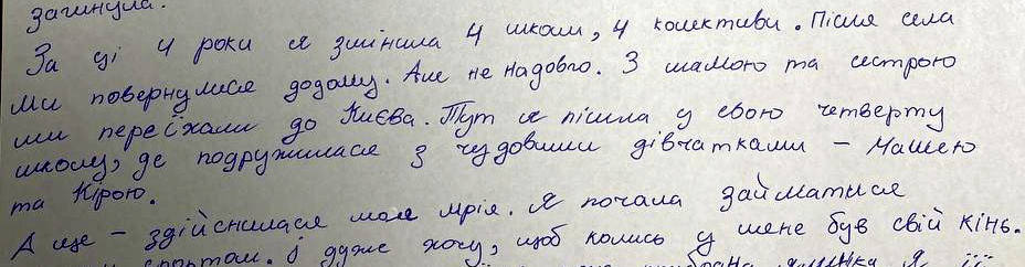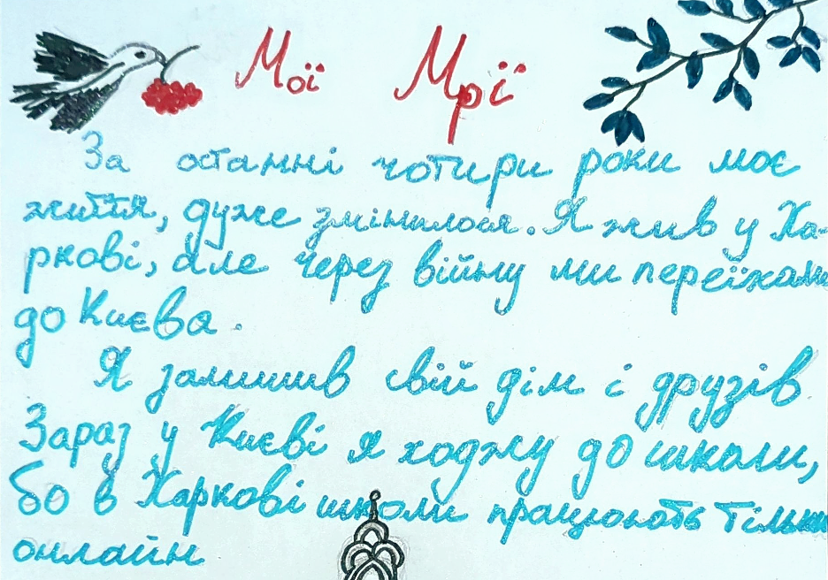 Maria, 12, IDP from Kharkiv notes: "In these four years, I've changed four schools, four groups of classmates. My mom, sister, and I moved to Kyiv. Here, I started my fourth school, where I made friends with wonderful girls – Maria and Kira. And also – my dream came true. I started doing horseback riding. And I really want to have my own horse someday."