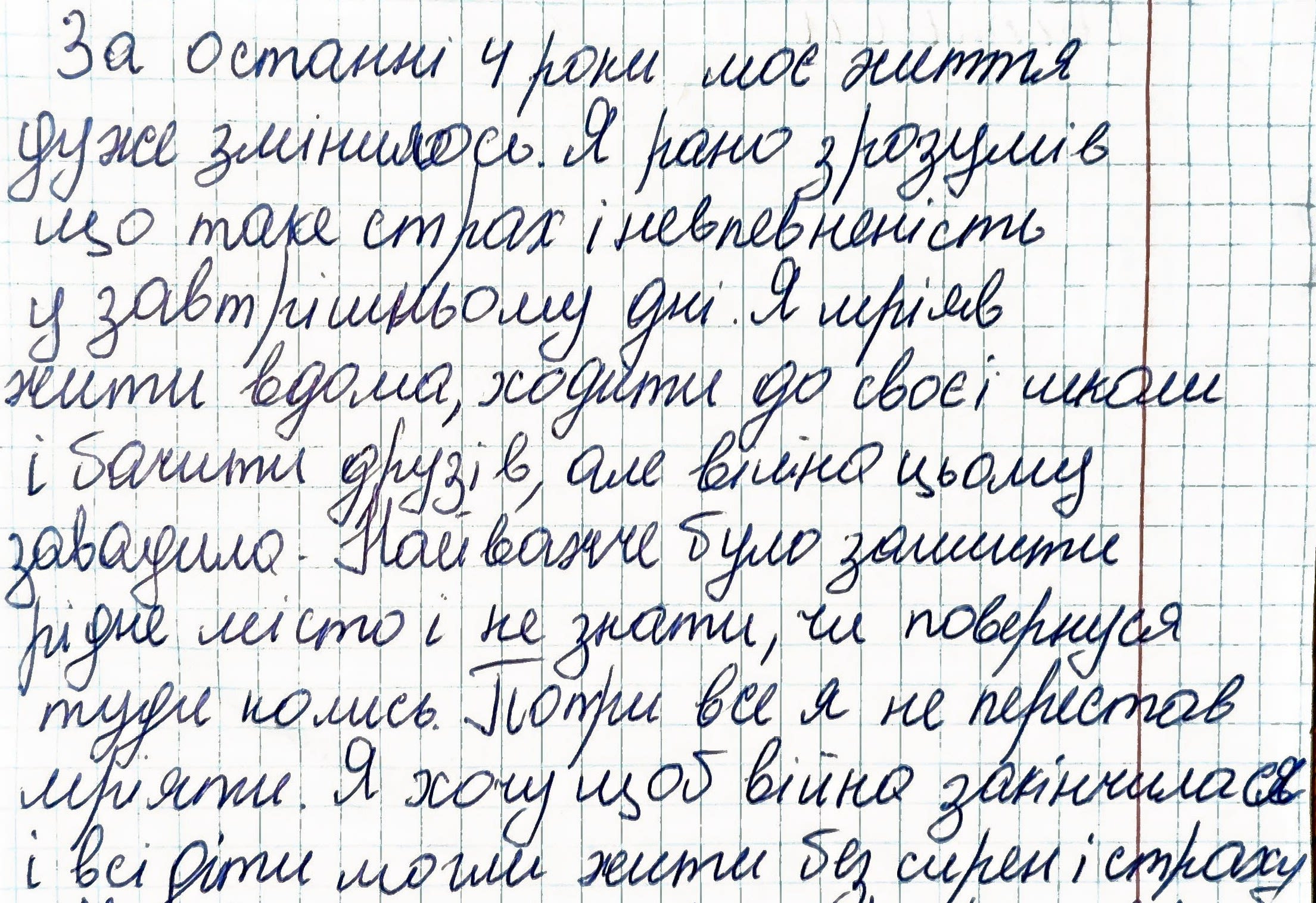 Maksym, 13, from Kherson region shares, "My life has changed a lot in the last four years. I learned pretty early what fear and not knowing what tomorrow will bring feel like. I used to dream about living at home, going to my school, and seeing my friends, but the war got in the way of all that. The hardest part was leaving my hometown and not knowing if I'd ever go back there. Even with all of this, I haven't stopped dreaming. I really want the war to end so all kids can live without sirens and fear".
