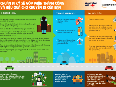 The Behaviour Change Communication (BCC) campaign in Vietnam will be underpinned by a call to action of “Migrate Safely." When thinking about migration, it is easy for Vietnamese youth to be enticed by the promise of a great job in an exciting city, especially when it only takes a few days to get there and people don't even need paperwork. This poster focuses on the legal path and the steps to take that path so that people are not victimized in the process.