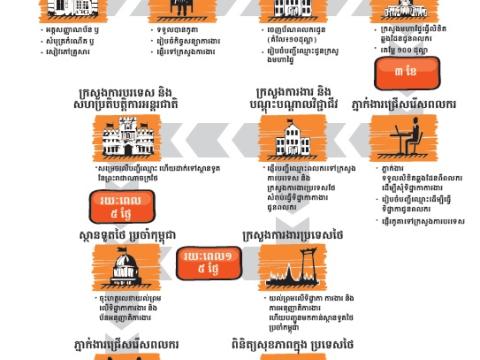 This infographic provides the step-by-step instructions for how to migrate safely and legally in Cambodia. It explains each of the steps required and the estimated cost and processing time for all of the documents needed. It is distributed and explained in detail to prospective migrants, as a way to underpin the "safe migration" messaging that is already being communicated.