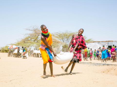 Beneficiaries carry food at a food distribution in Kenya