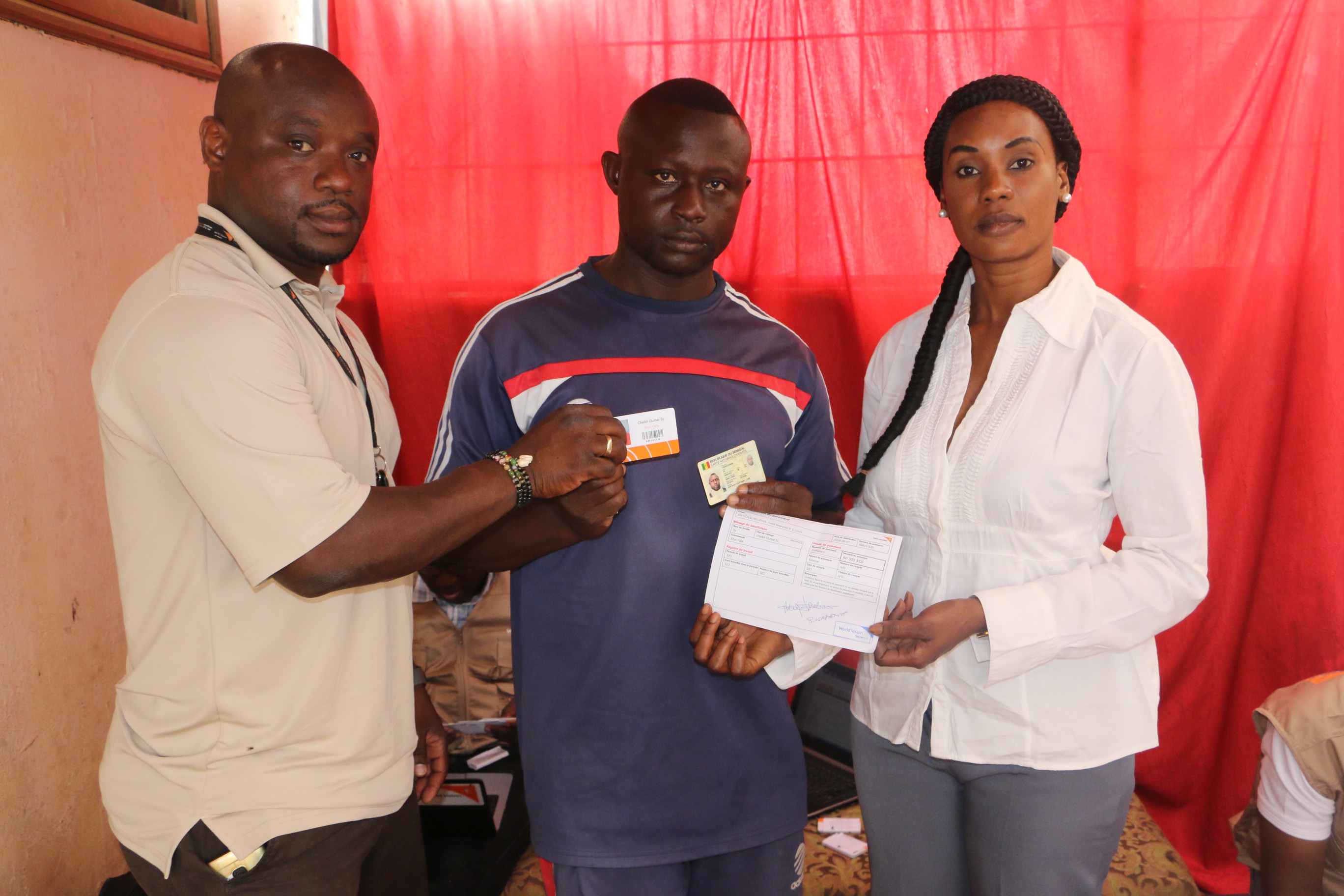 Mme Sy à droite en remettant un bon à un récipiendaire en compagnie de Samuel Amenyo, le responsable HEA de World Vision
