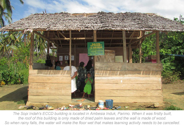 In Sopi Indah village, the Early Childhood Care and Development (ECCD) is located in the foothills, two kilometers away from the main road. In this community, most of the villagers work as coconut and cocoa farmers. To access this school, visitors pass through empty fields and travel on a difficult road.