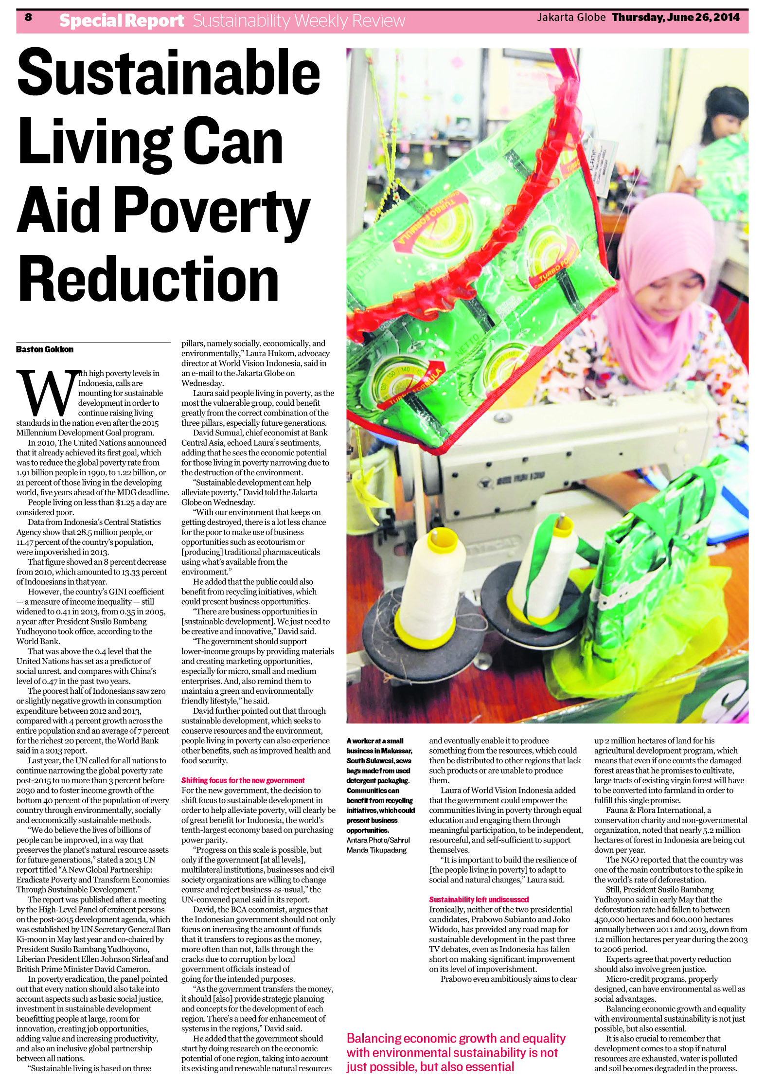 With high poverty levels in Indonesia, calls are mounting for sustainable development in order to continue raising living standards in the nation even after the 2015 Millenium Development Goal program.