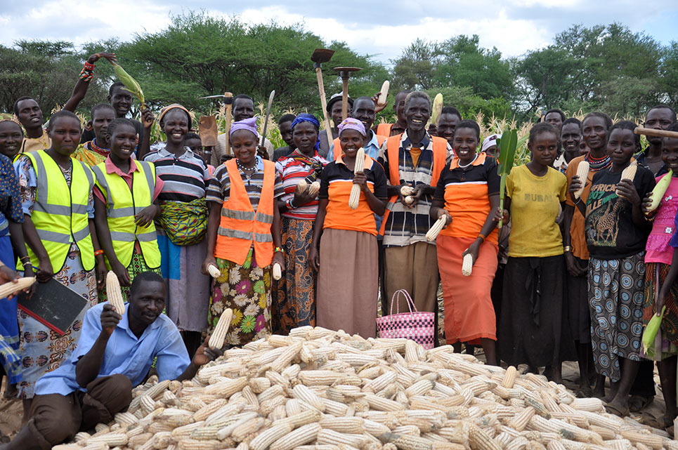 Beneficiaries of food for assets (FFA) project supported by World Vision in partnership with World Food Program pose in front of some of their members harvests. Photo by Lucy Murunga