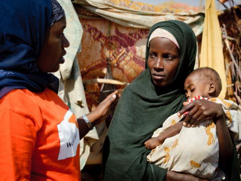 A measurement of her upper arm circumference confirmed that Zam Zam was severely malnourished. World Vision provided sachets of Plumpy’Nut™ (a peanut-based, nutrient-dense food) to feed Zam Zam, and urged Layla to take her baby to the camp center for malnourished children run by another organization.