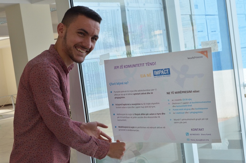 “Isha skeptik, nuk besoja se ne, të rinjtë, mund të bëjmë ndonjë ndryshim të madh.”- thotë ai. Për herë të parë, para 2 vitesh, dëgjoi nga një shoqe që organizata World Vision kishte krijuar dhe mbështeste grupe të rinjsh, të quajtur Impact Clube. “Mendimi i parë që më erdhi në mendje ishin dreka, darka dhe udhëtime jashtë Tirane dhe u bëra pjesë edhe unë”- kujton 18-vjeçari.