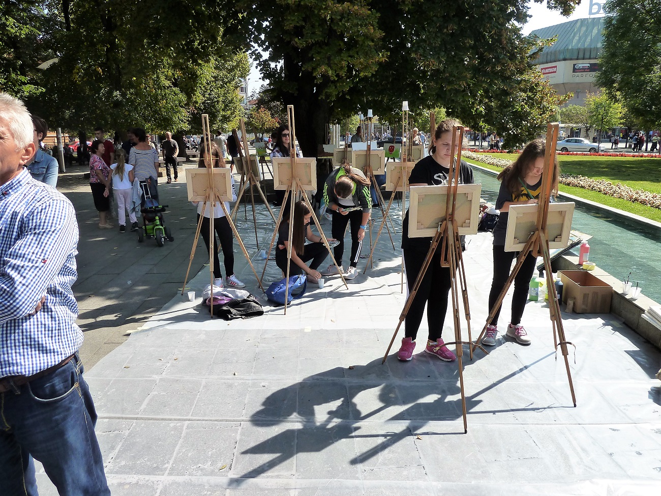 Artists were painting in the central park in Banja Luka, a pedestrian zone that is very visited during the day. Many citizens were attracted by the way that Vahid Tirić was painting. Vahid is an artist from Vitez who is skilled in painting with his foot. Next to him, there was a group of children from mine affected communities of Banovići, Lukavac and Petrovo. They were given the “impact of mines” as a motive for their paintings and were encouraged to be creative and positive. They produced 15 paintings that mostly depict children near minefields, sending a clear message to the relevant institutions to demine local communities for safe childhood in mine affected municipalities.