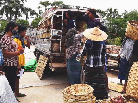 The dawn breaks together with the voices of engines from the cargo trucks and labours loading palm baskets. Ma Phyu, a volunteer of World Vision, and other palm farmers and buyers are also in the crowd loading their products to be sold Zaw Gyi trading company limited.