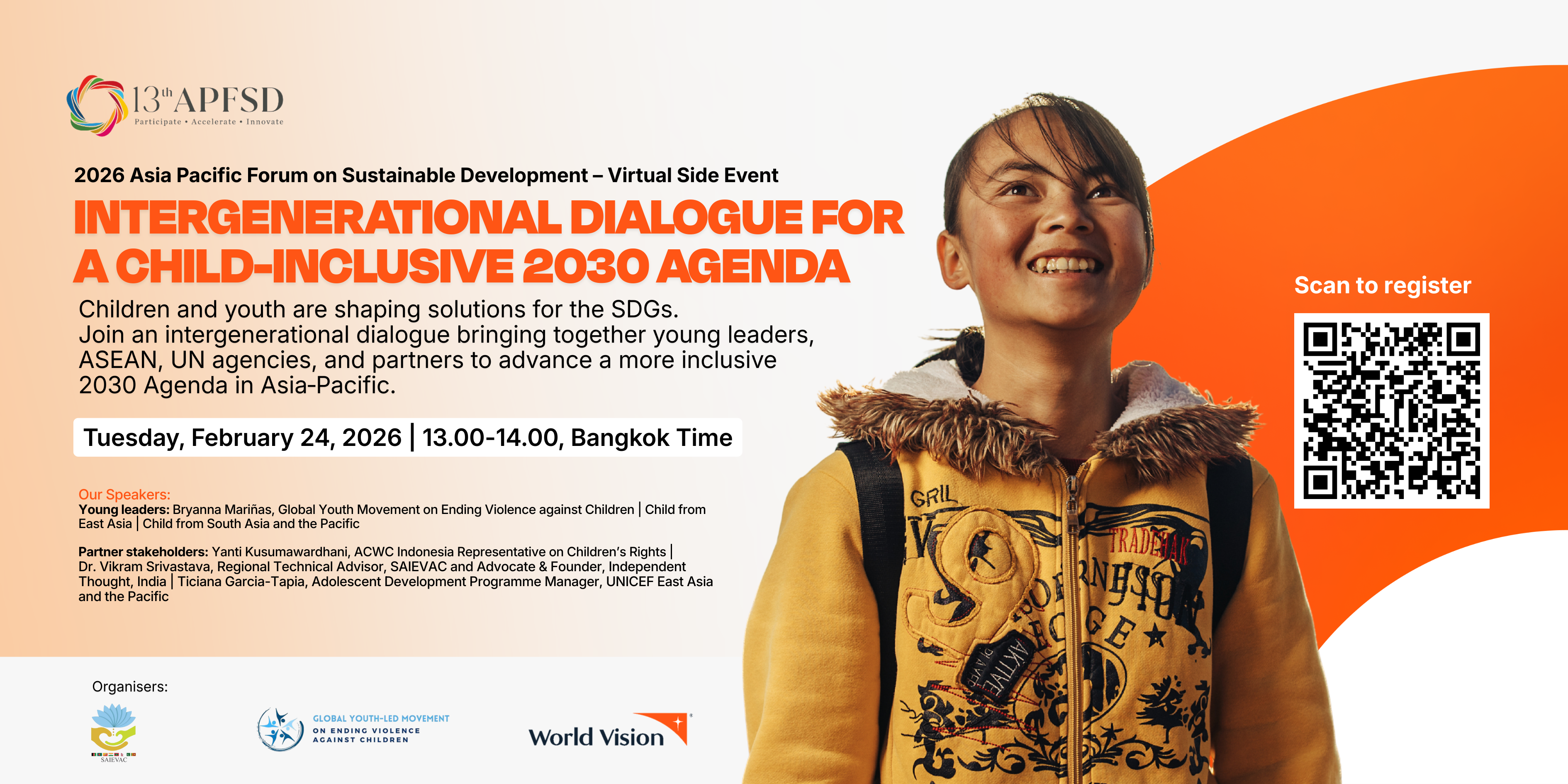 During the APFSD 2026 virtual side event, "Intergenerational Dialogue for a Child-Inclusive 2030 Agenda," child leaders from 13 countries partnered with World Vision, UNICEF, ASEAN Commission on the Promotion and Protection of the Rights of Women and Children (ACWC), and South Asia Initiative to End Violence Against Children (SAIEVAC) to demand a seat at the decision-making table. Rejecting "tokenistic" inclusion, they urged regional leaders to co-design Global Goals solutions alongside them, prioritising livable cities, clean energy, safe water, and purposive partnerships for their communities.
