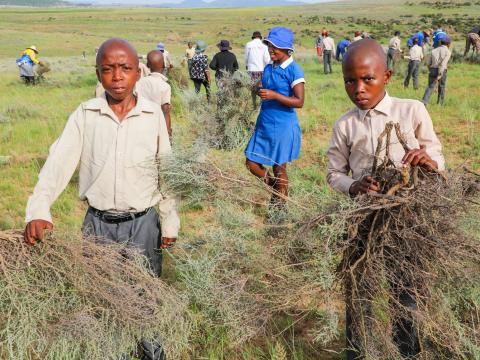 In the face of this alarming global challenge, a community-led initiative took place in Ha Hlalele, Rothe Programme Area where World Vision Lesotho works. World Vision, in collaboration with the Ministry of Environment and Forestry, orchestrated a Brush Control initiative alongside dedicated Land Rehabilitation groups, local communities and children. This initiative centered around the removal of weeds on the rangelands, imparting essential skills for sustainable management, biodiversity conservation, and the enhancement of the Agri-Food Systems.