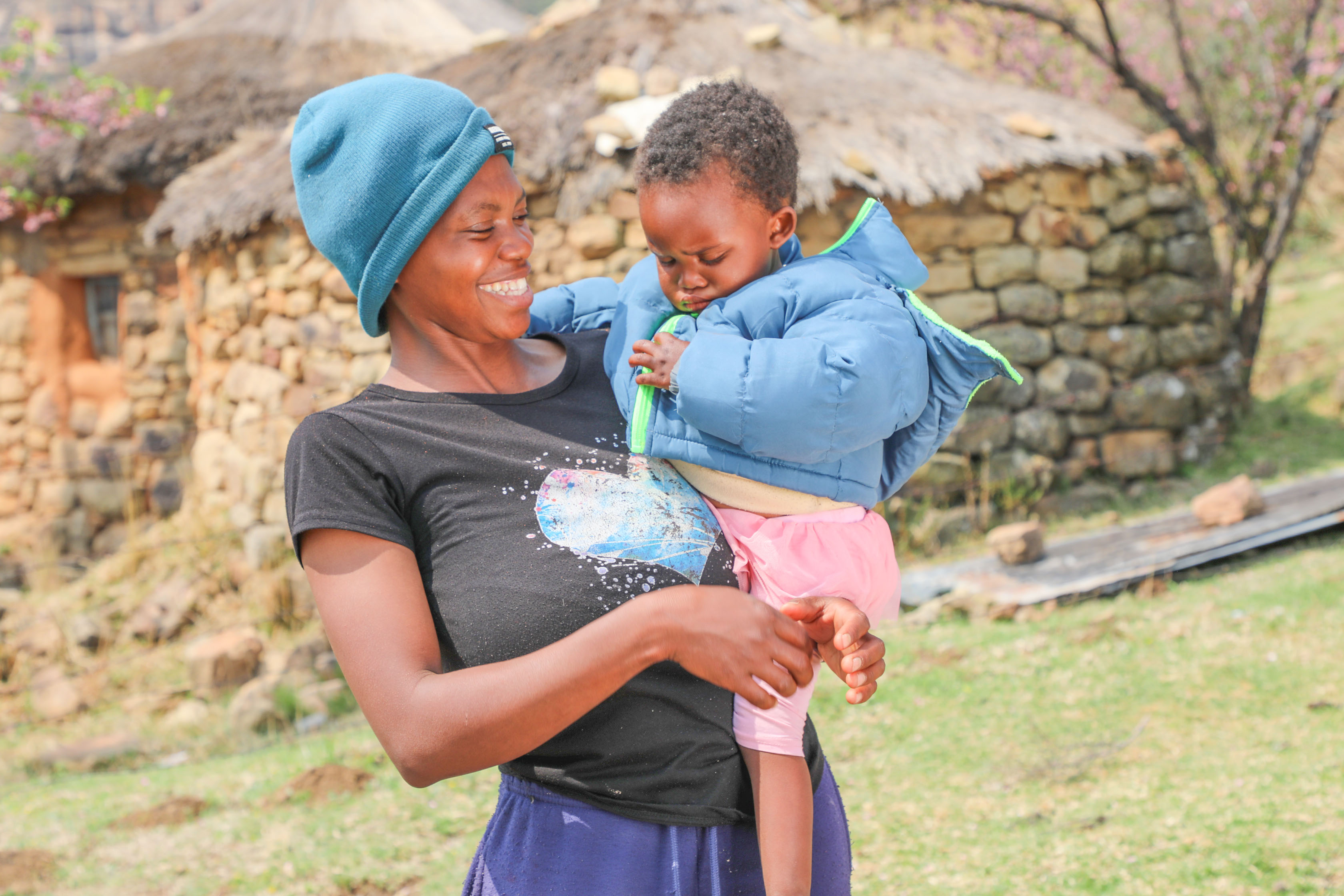 Tsoenyane and her daughter, Lineo wearing a warm winter jacket provided by World Vision