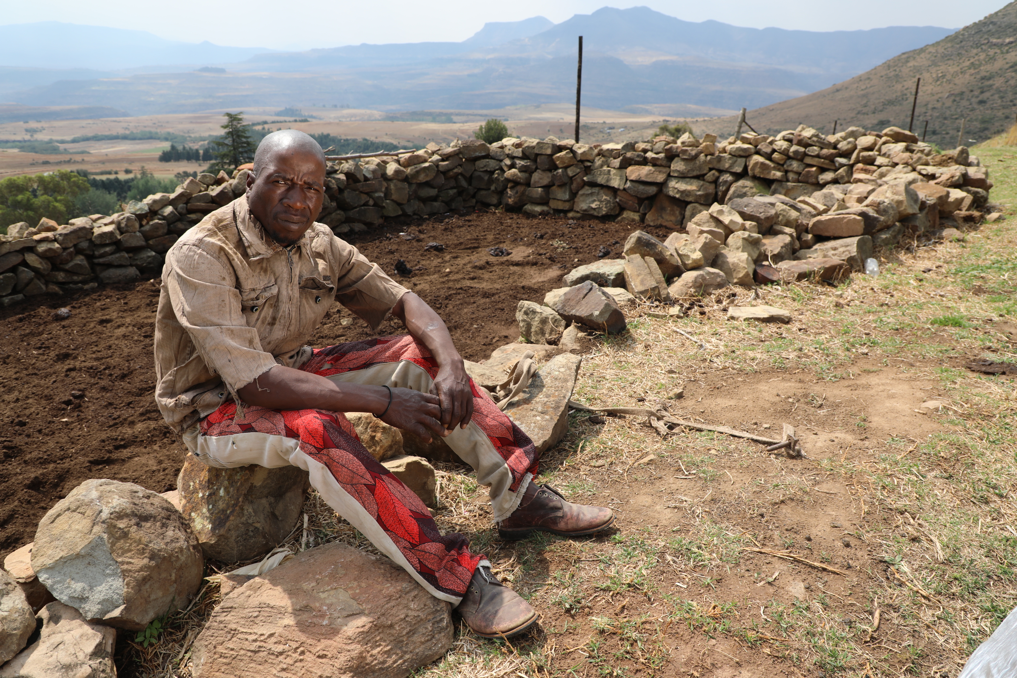 By the kraal, Moeketsi rested quietly, his worn clothing telling a story of hardship.