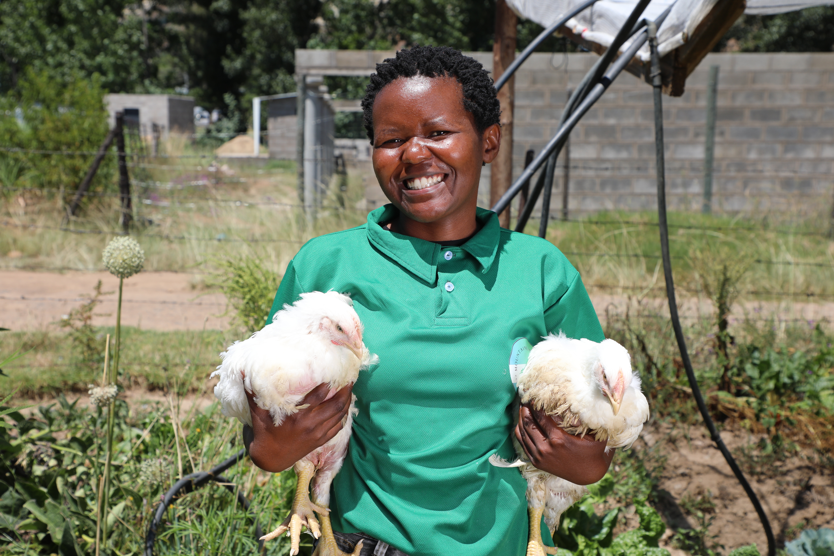 Limakatso carries chickens she restocked after being empowered, gaining skills and confidence through trainings