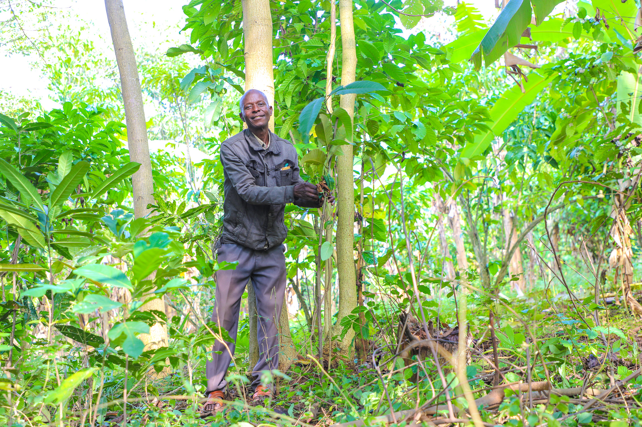 Encouraged, Patrick turned the once-barren acre in front of his home into a demonstration garden for other farmers. He intercropped regenerated trees with bananas, coffee, and mangoes, using fallen leaves as mulch to enrich his soil. His yields soared, and for the first time in years, Patrick had enough food for his family and surplus to sell.