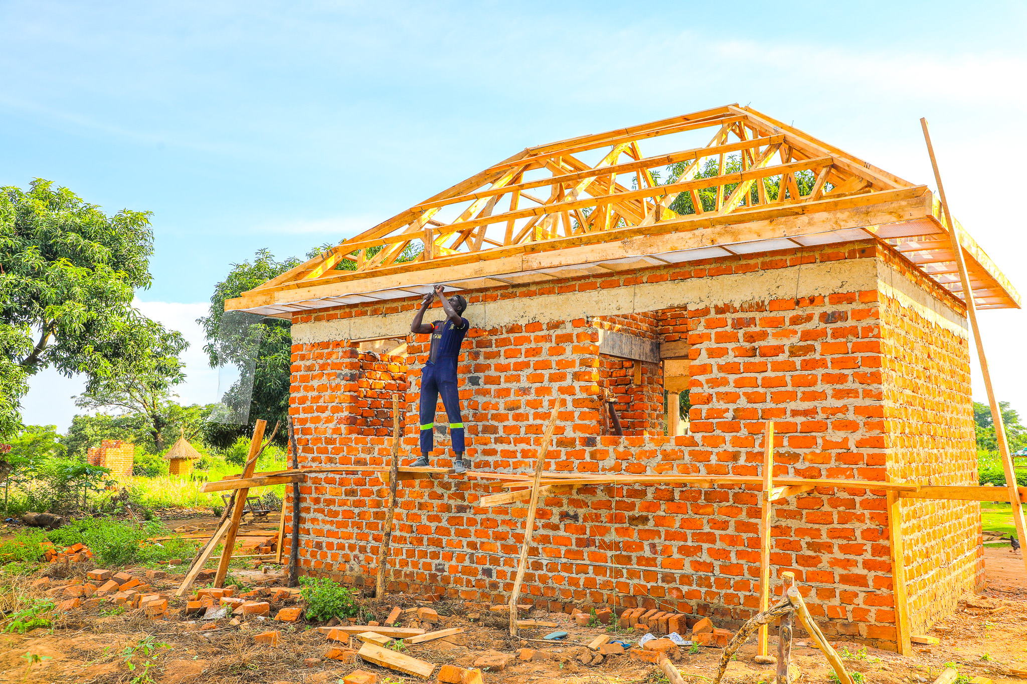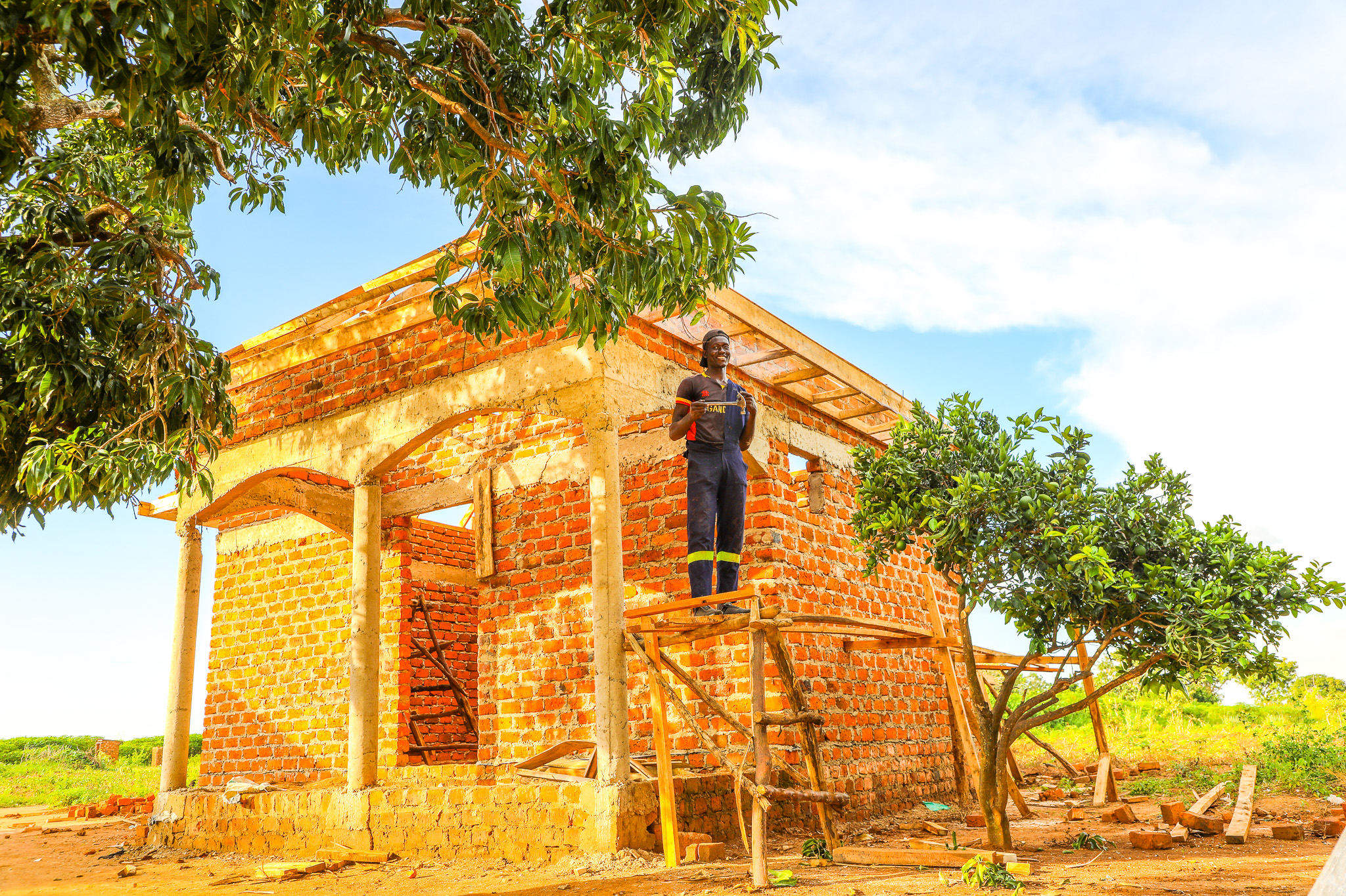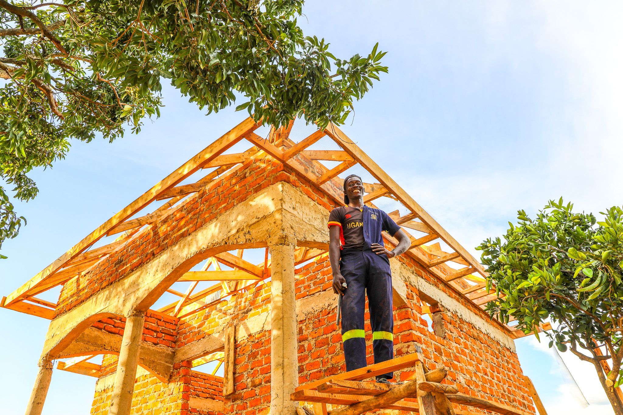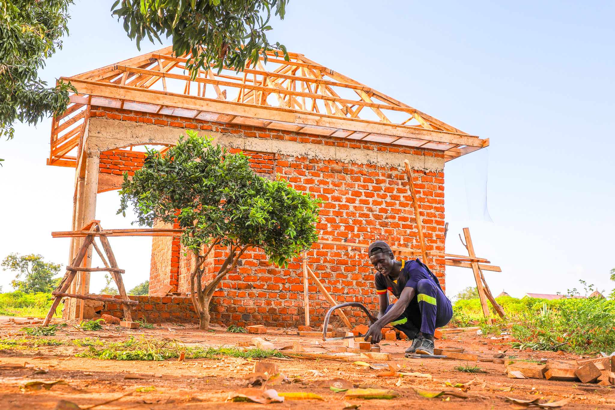 Stephen Alole, 21, is a young and passionate carpenter in his village. He adjusts his overall as he squints at the skeletal frame of the roof above him.