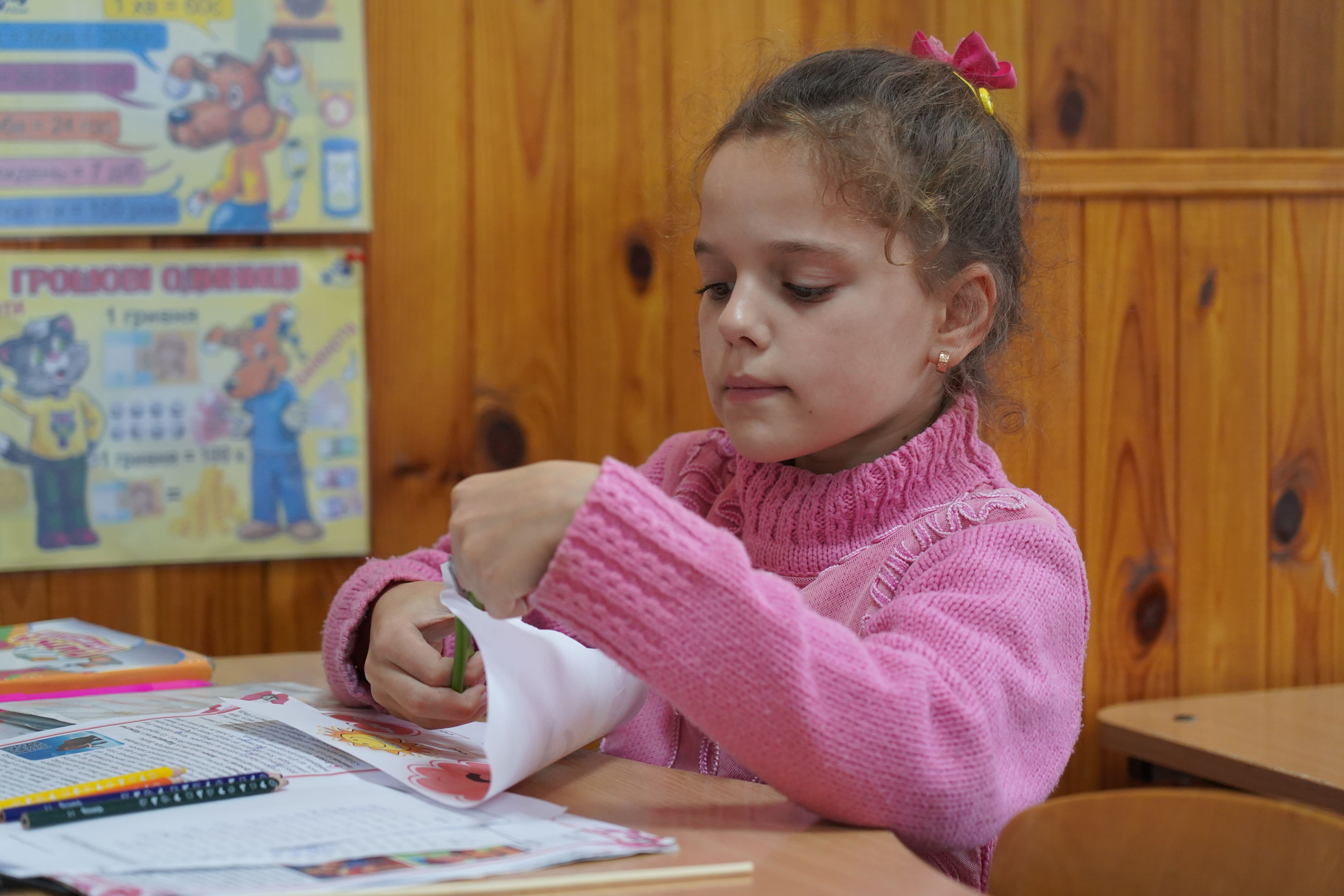 Nine-year-old Karolina described the daily reality many children continue to face: “When the air raid alarm goes off, we have to run to the shelter. It’s scary. In the catch-up classes, I could focus on learning Ukrainian and Math again. I wanted to keep learning, even when it felt frightening.”