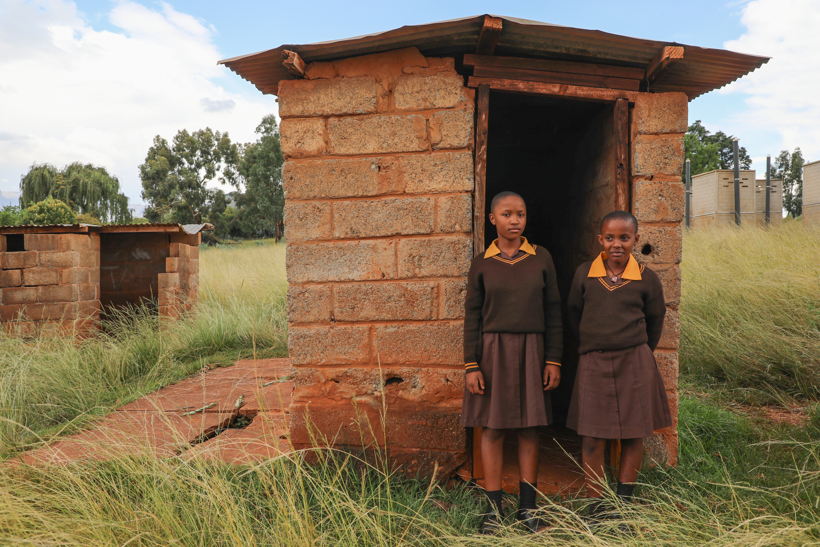 Mankoane and Reabetsoe next to the unsafe, dilapidated toilet they previously used as learners